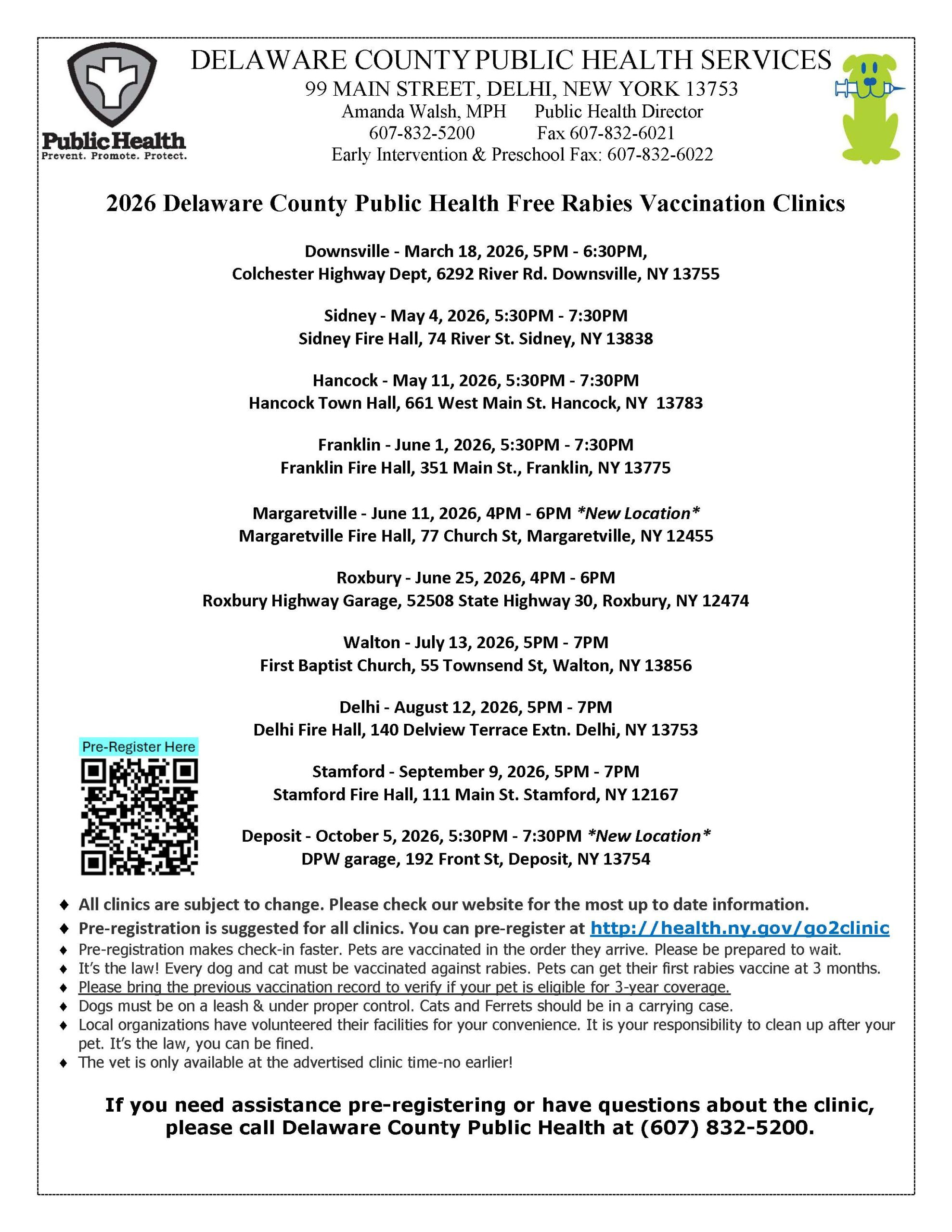 Renewing, or getting a new DOG LICENSE, is easy, click here for a dog license application. A completed application must be taken or mailed to Franklin Town Clerk at 554 Main Street Franklin, NY 13775 (office hours--Tuesday & Thursdays 9-11:30am & 2:30-5pm and Fridays 6-8pm). Please see the application for the license fee structure. You will need proof of a current rabies vaccination, which, if you do not already have, you can get a copy from your veterinarian, or from numerous mobile vet clinics in Delaware County which you can locate online. Make sure the tag is properly fastened to your DOGS' collar at all times, especially when outdoors.